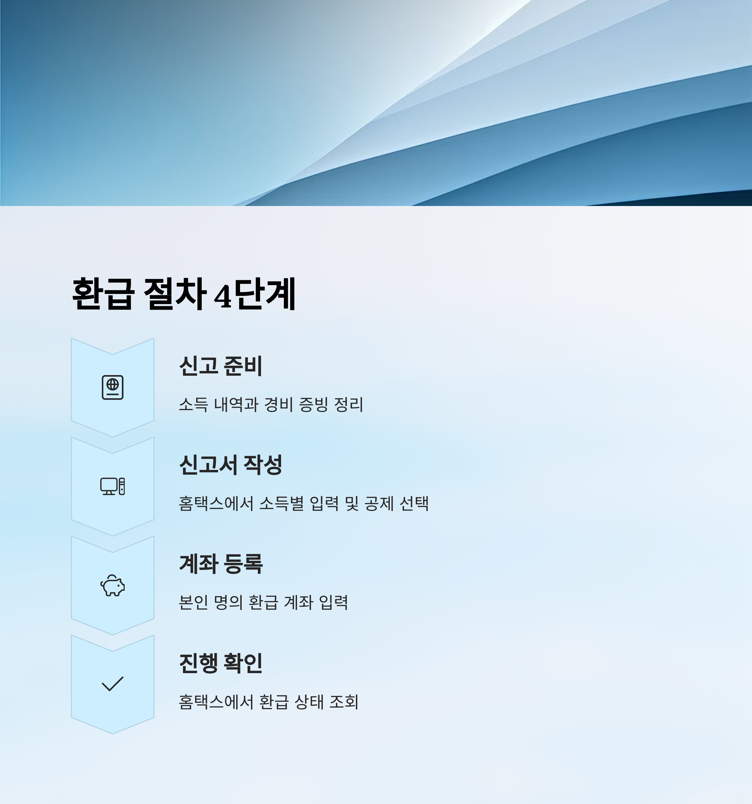 종합소득세 환급을 받기 위한 절차는 크게 4단계로 나눌 수 있어요. 첫 번째는 ‘신고 준비’ 단계로, 소득 내역과 경비 증빙, 세액공제 항목 등을 정리하는 거예요. 특히 프리랜서나 자영업자라면 매출과 매입 자료를 꼼꼼하게 챙겨야 해요. 그리고 국세청 홈택스에서 제공하는 '모의계산' 기능도 꼭 활용해보길 추천해요!