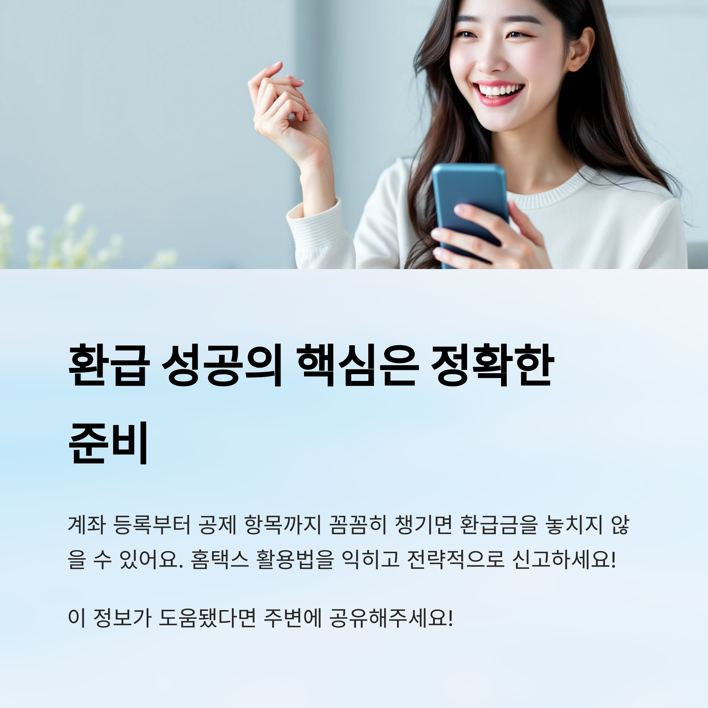 환급 계좌 입력만 정확하게 해도 전체 환급 프로세스의 절반은 성공한 거예요! 홈택스 로그인 후 반드시 ‘환급계좌 등록 확인’ 버튼을 눌러보는 거, 절대 잊지 마세요! 😊