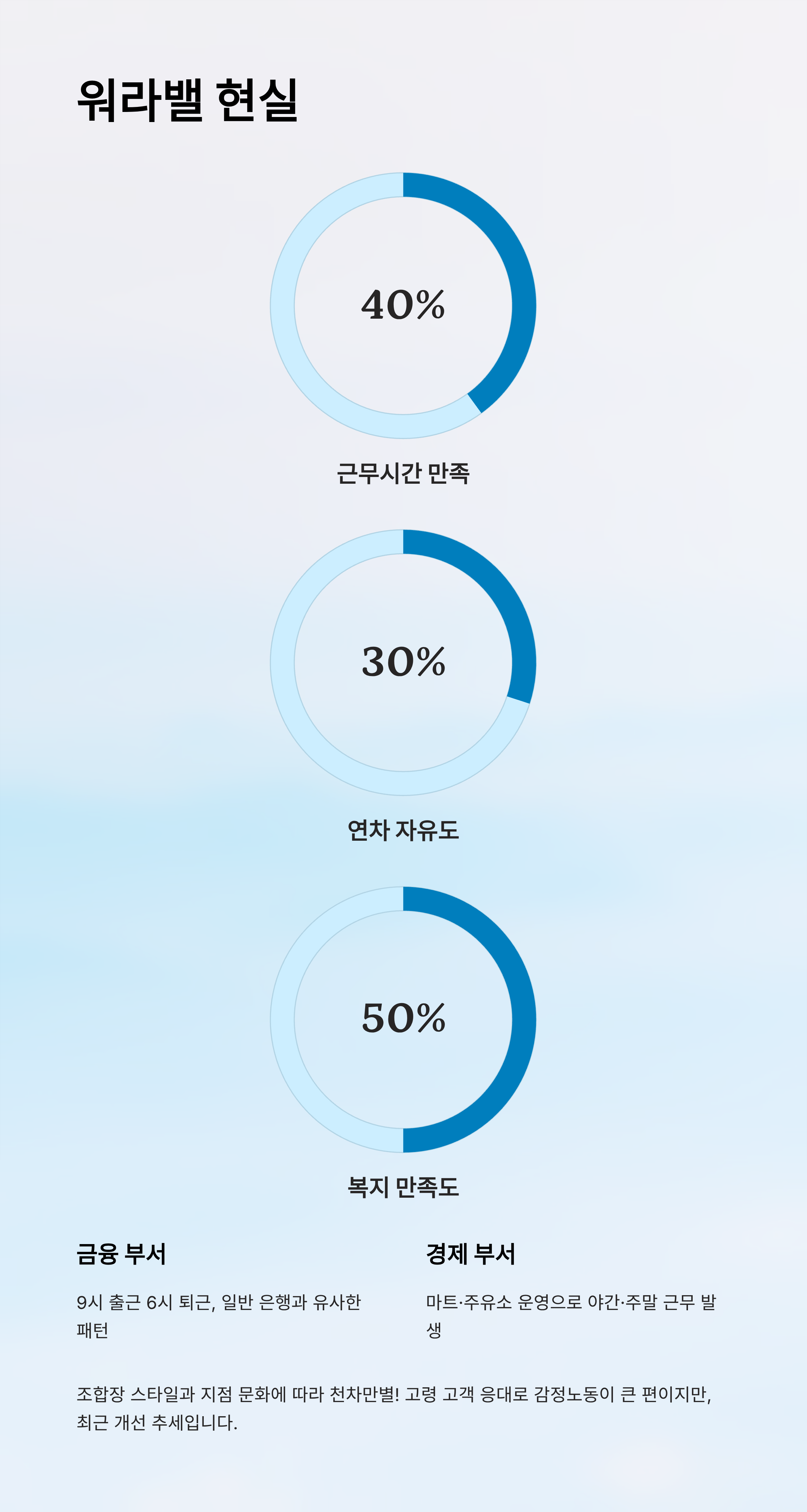 | 근무시간 만족도 | 40% | 35% | 25% |