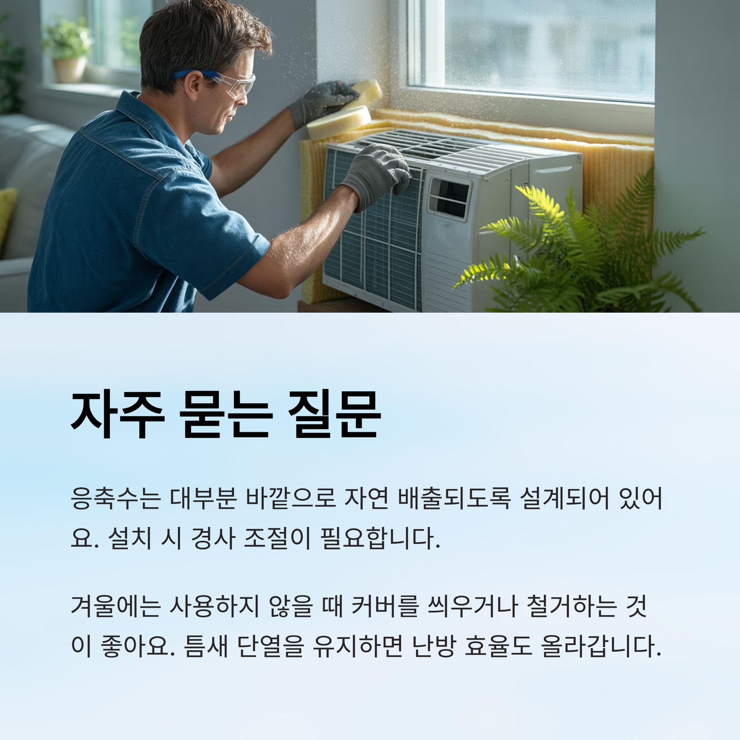 A8. 사용하지 않을 땐 철거하거나, 커버를 씌워 보관하는 것이 좋아요. 틈새 단열도 유지하면 난방 효율이 올라가요.