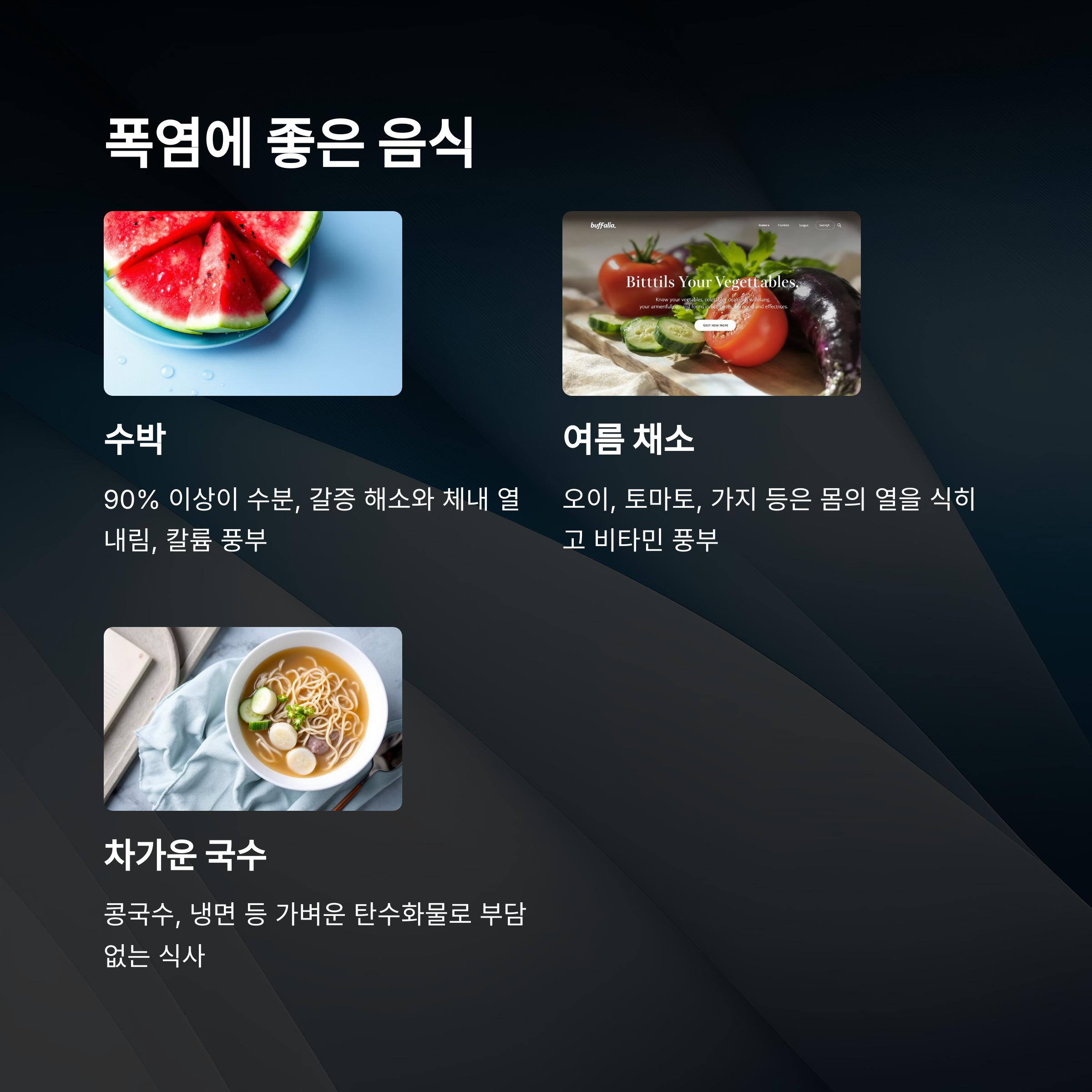 더위가 심해질수록 입맛이 떨어지기 쉬워요. 하지만 제대로 먹지 않으면 체력이 금세 떨어지기 때문에, 폭염 시에는 체온 조절을 도와주고 수분 보충도 되는 음식을 섭취하는 게 정말 중요해요. 🍽️