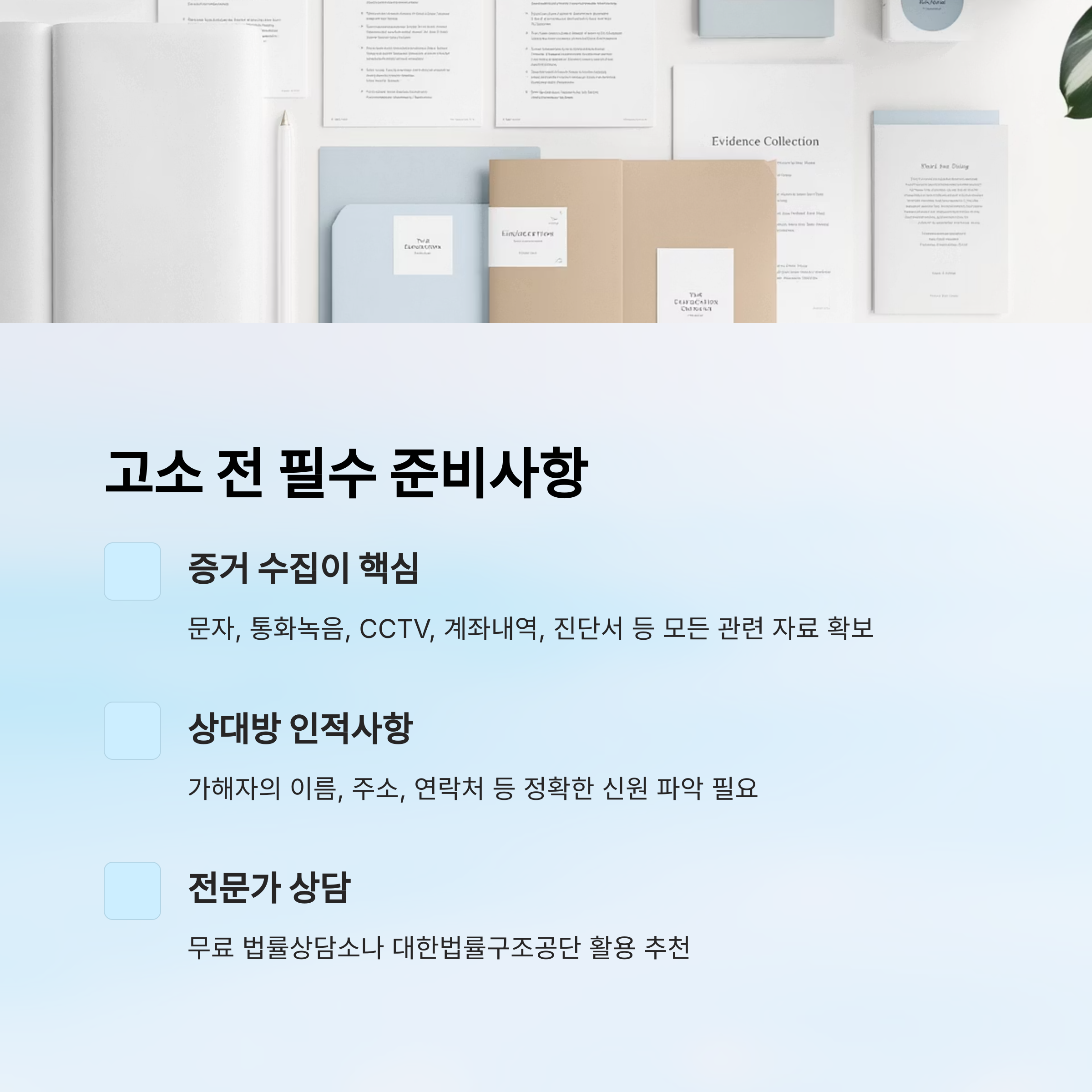 형사 고소를 진행하기 전에 가장 중요한 건 바로 '증거 수집'이에요. 실제 범죄 행위가 있었다는 걸 입증해야 수사가 본격적으로 진행되기 때문에, 문자, 통화 녹음, CCTV, 계좌 내역, 진단서 등 모든 관련 자료를 최대한 확보해야 해요.