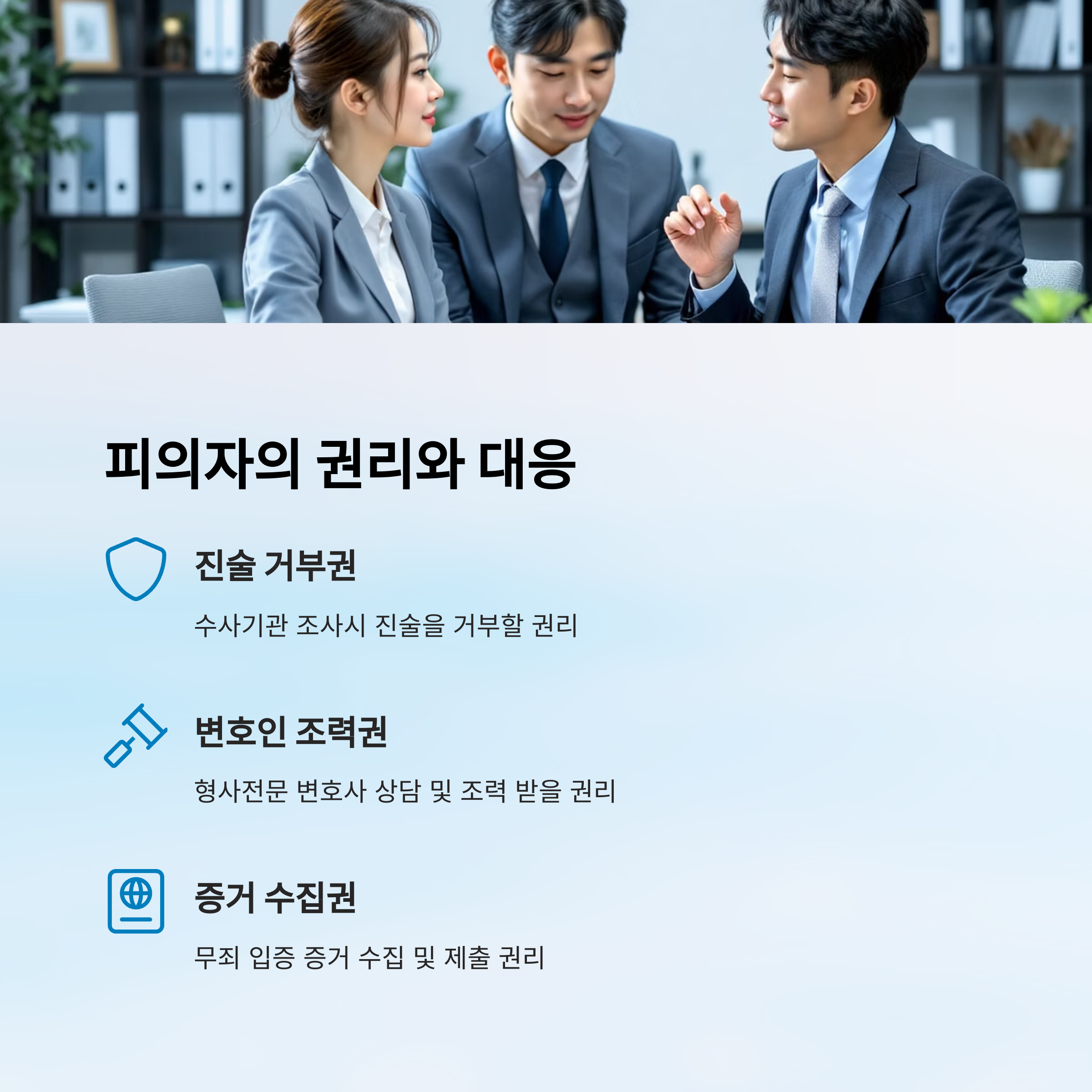 또한 피의자는 무죄를 입증할 증거를 수집할 권리가 있고, 억울한 고소라면 무고죄로 맞고소하는 것도 가능해요. 수사기관이 한쪽 편만 듣고 판단하지 않도록, 본인의 입장을 정확히 설명하고 자료로 뒷받침하는 것이 중요해요.