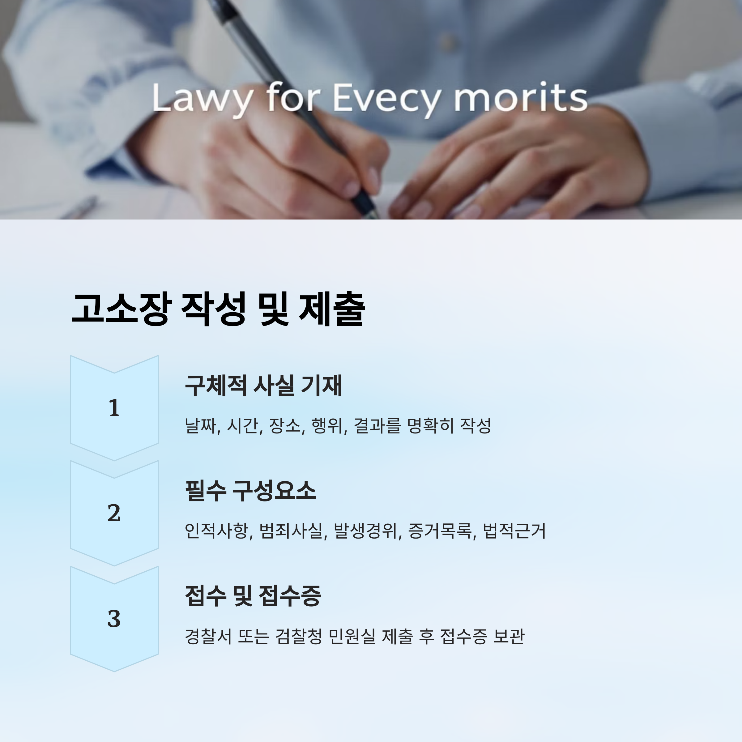 고소장의 기본 구성은 다음과 같아요. 고소인과 피고소인의 인적사항, 범죄사실의 요지, 발생 경위, 증거 목록, 법적 근거 등을 담아야 하죠. 그리고 증거자료는 별첨 형식으로 첨부하는 게 일반적이에요.