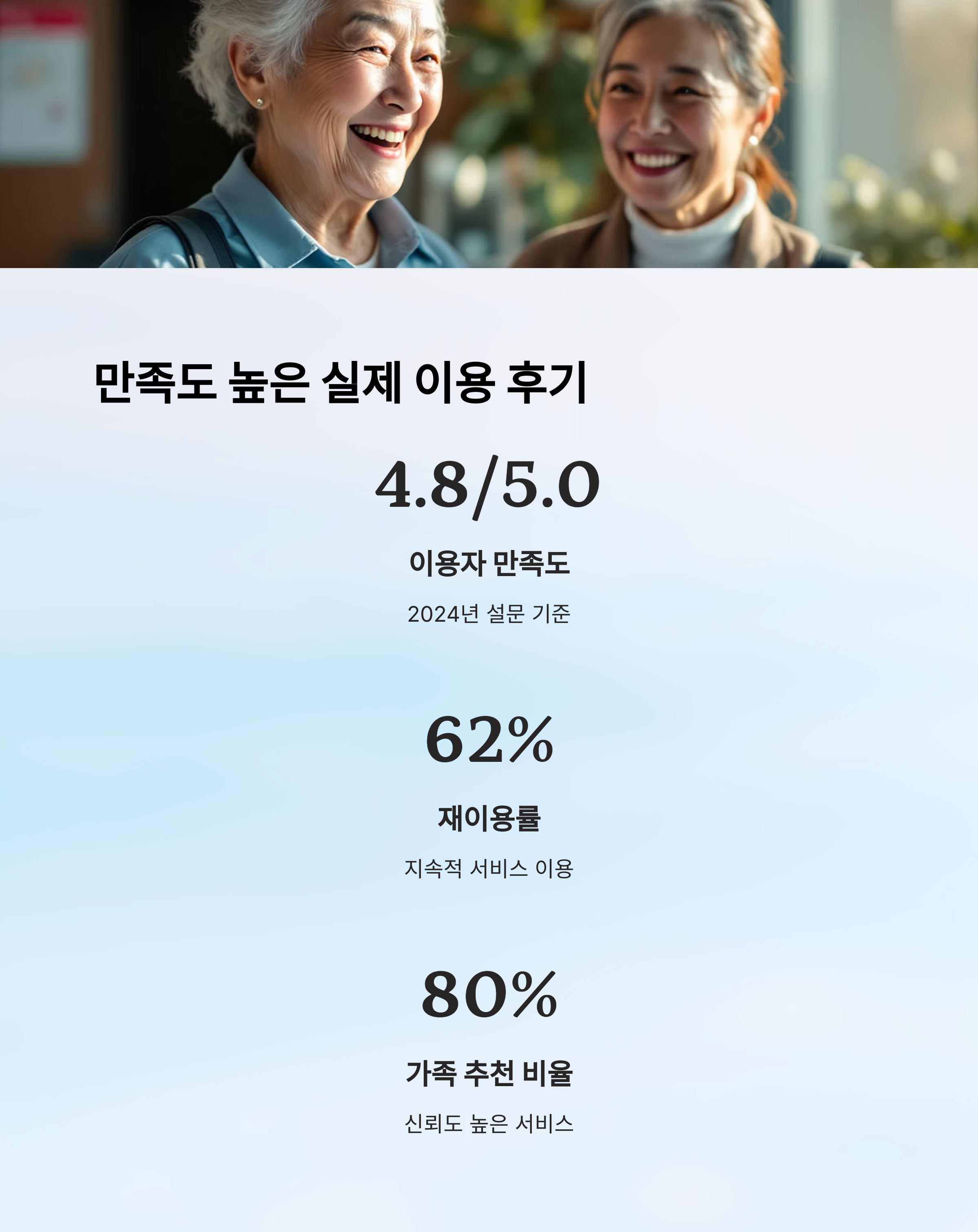 또 다른 후기에서는 70대 여성 박순자 어르신이 나와요. 평소 혈압이 높아 병원 방문이 잦았지만, 자녀들이 외국에 거주해 항상 혼자 병원에 가야 했죠. 혼자 갈 때마다 불안하고 스트레스를 받았던 그녀는 서비스 후기를 통해 이렇게 말했어요.