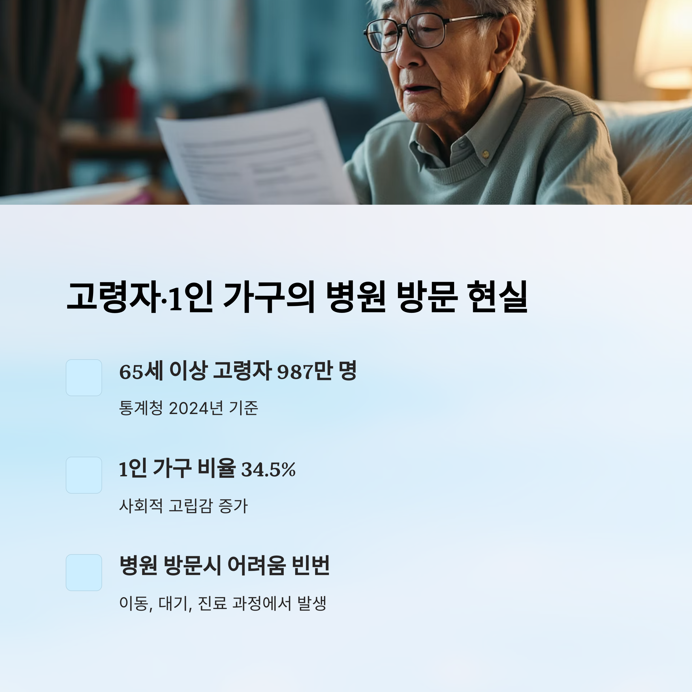 고령화 사회가 빠르게 진행되면서, 병원에 혼자 가기 힘든 분들이 늘어나고 있어요. 가족이 멀리 있거나 시간이 맞지 않아서 혼자 병원을 가는 건 쉽지 않죠. 특히 고령자나 1인 가구에게 병원 방문은 신체적으로나 정신적으로도 큰 부담이에요.