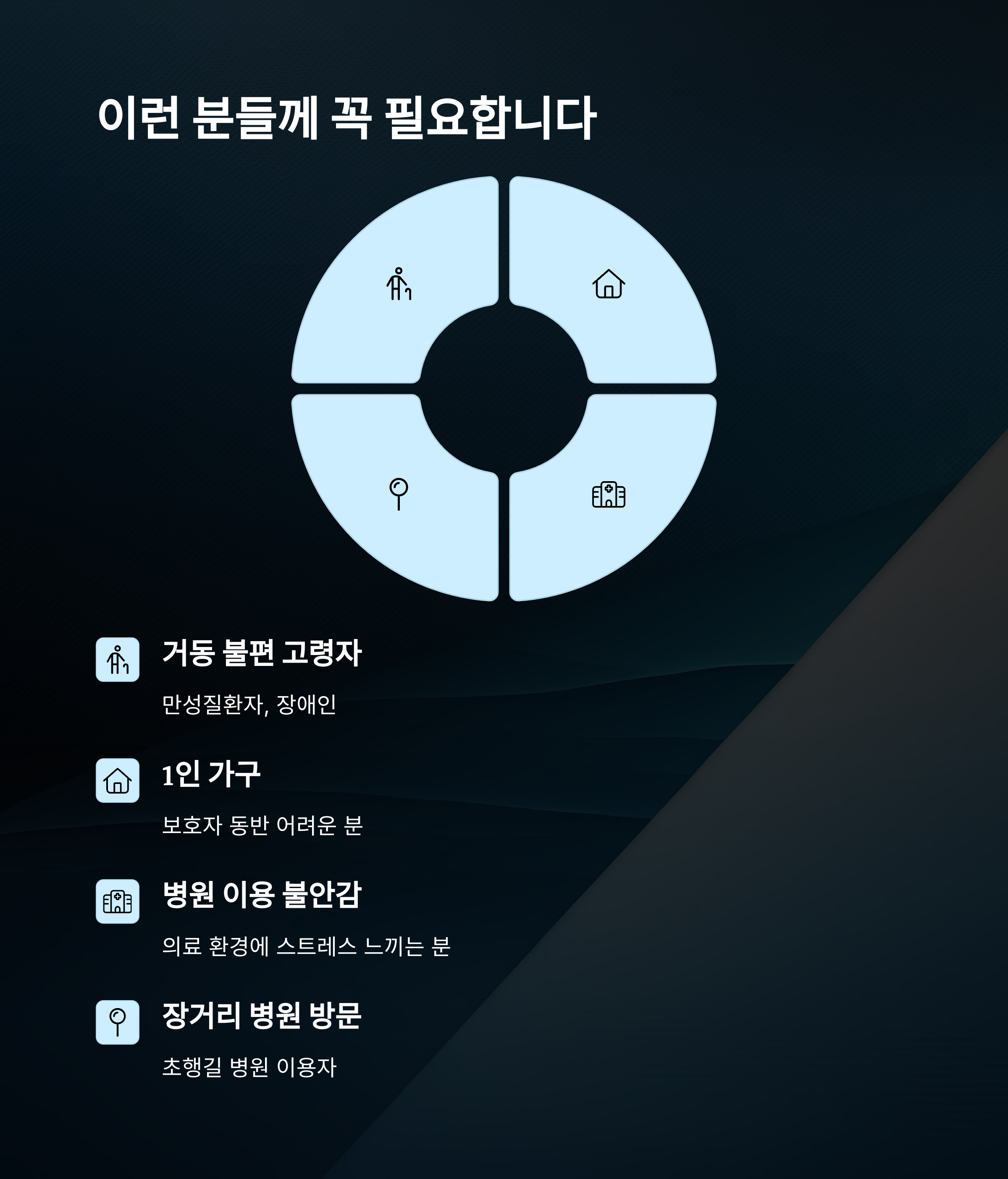 | 고령자 단독 진료 | 이동과 설명 이해 어려움 | 병원 내 이동, 설명 동행 |
