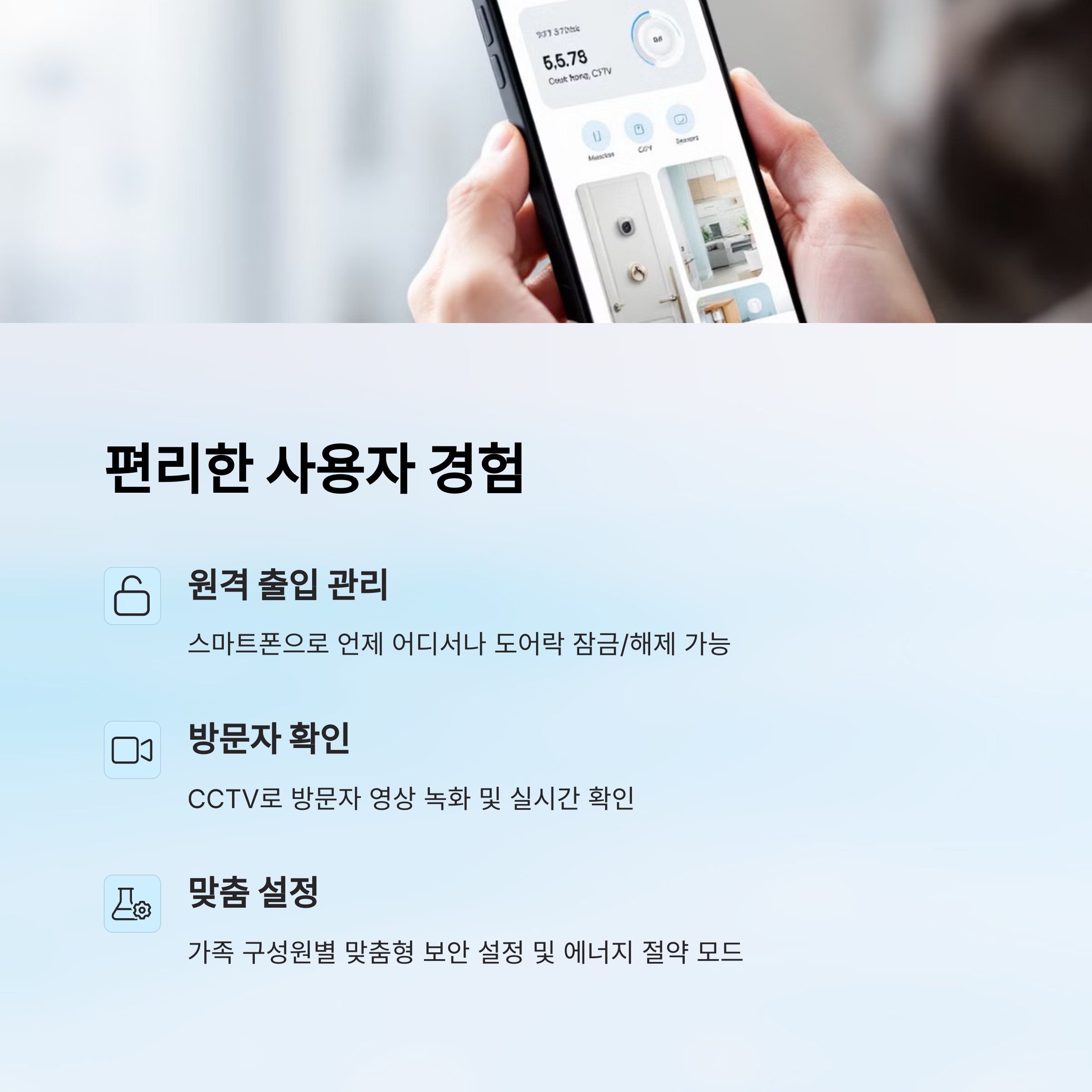 🔒 스마트 도어락: - 비밀번호, 앱, 지문, 카드 등으로 출입 제어 - 원격 잠금/열림 가능, 침입 감지 시 자동 알림