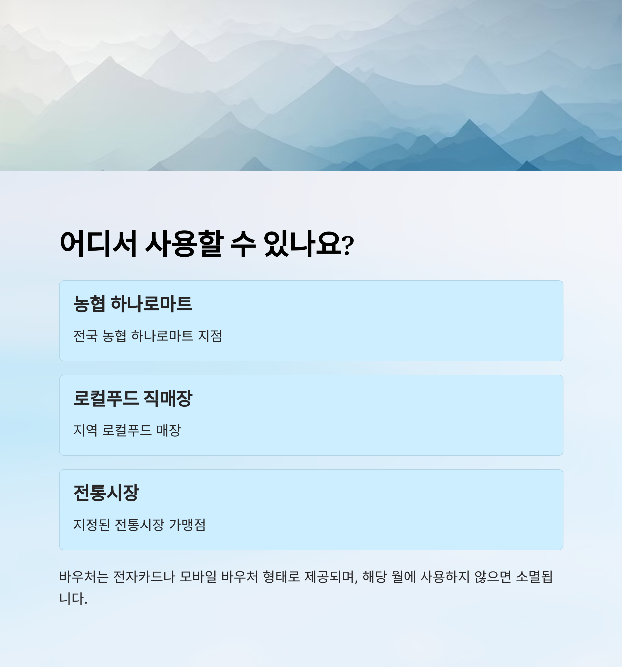 | 사용 가능 매장 | 농협 하나로마트, 로컬푸드 직매장, 전통시장 일부 가맹점 |