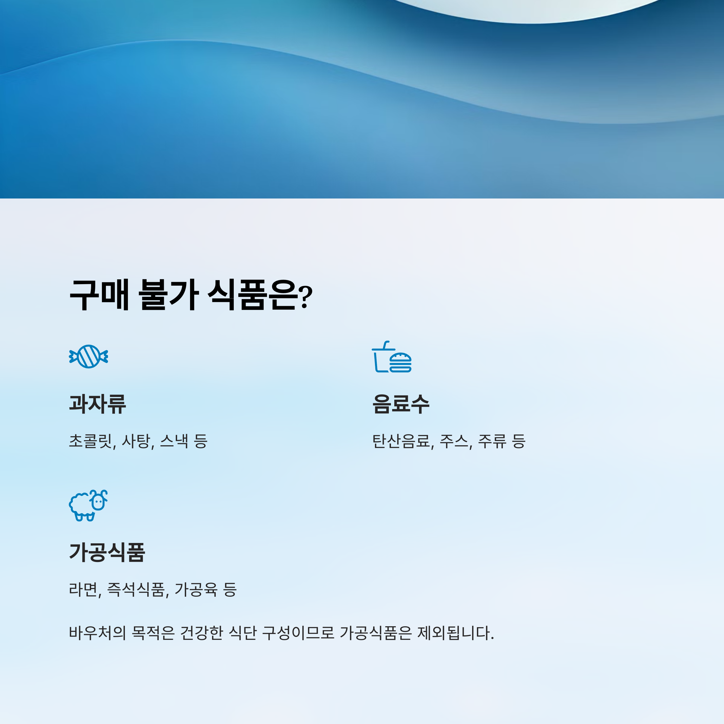 반면, 초콜릿, 라면, 탄산음료 같은 가공식품은 구매할 수 없으니 바우처를 사용할 때 유의해야 해요. 🙅♀️