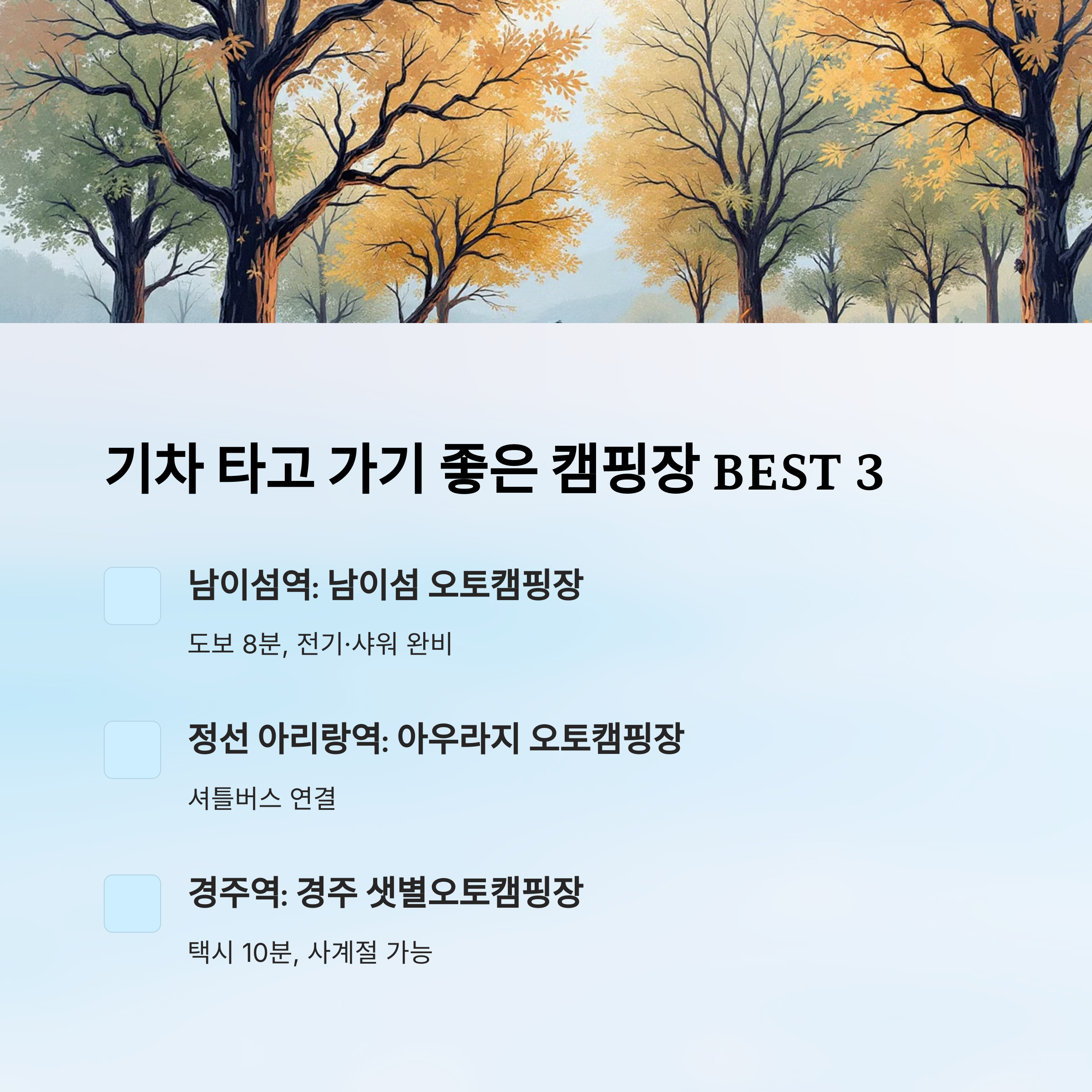 기차로 캠핑장에 갈 때는 예약을 미리 하고, 역에서 캠핑장까지의 교통편을 확인하는 것이 좋아요. 짐이 많다면 기차역 물품보관함을 활용해 보세요! 🎒