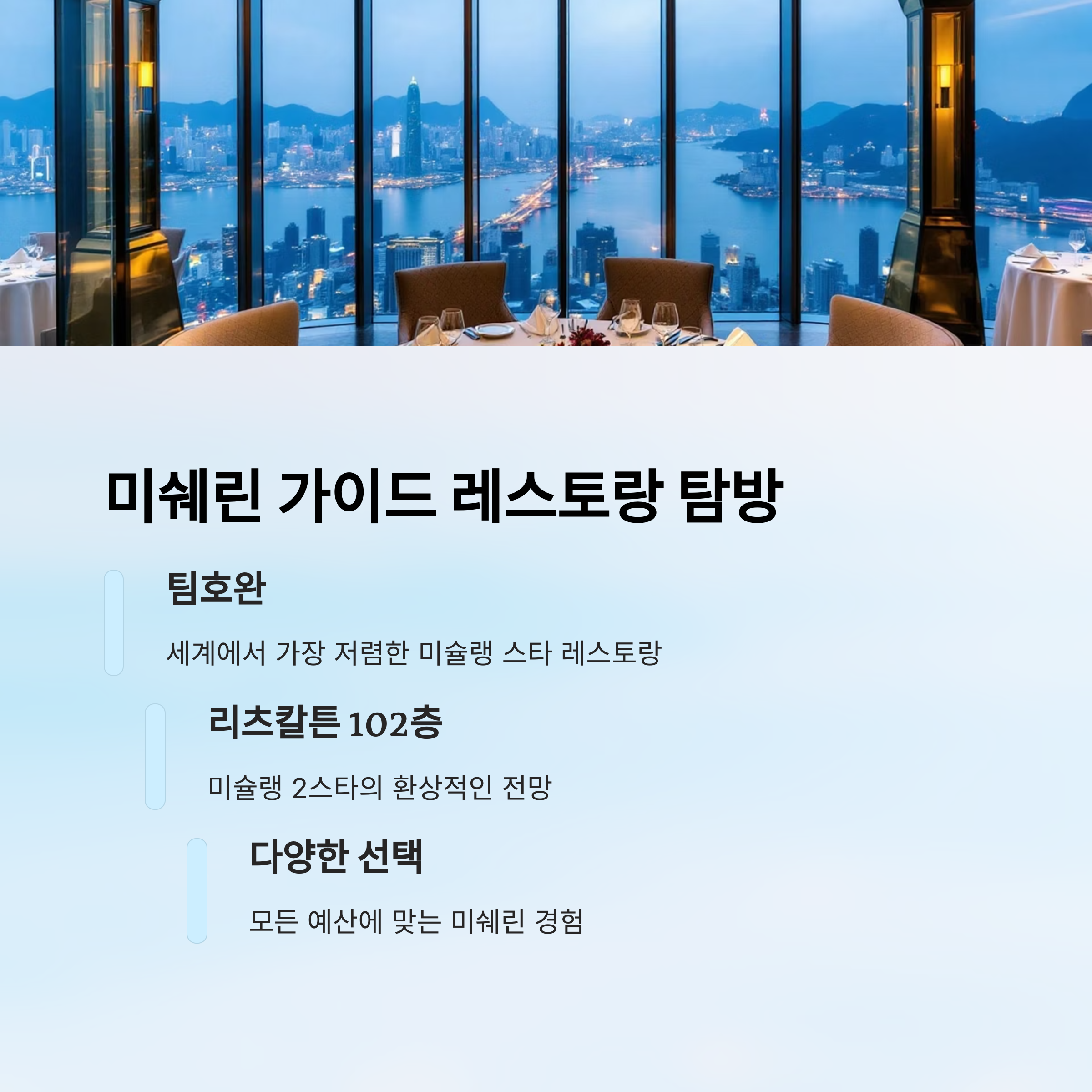 홍콩은 아시아 최초로 미쉐린 가이드에 등재된 도시 중 하나예요. 고급 레스토랑부터 가성비 좋은 맛집까지 미쉐린 스타를 받은 곳들이 많아요. 특히 '팀호완(Tim Ho Wan)'은 세계에서 가장 저렴한 미쉐린 원스타 레스토랑으로 유명해요. 🍽️