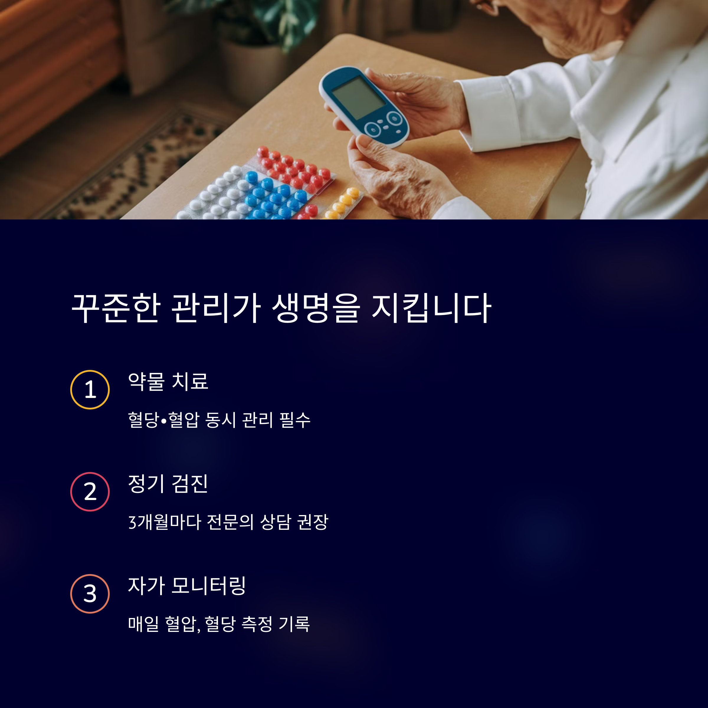 📌 **정리하자면, 고혈압과 당뇨가 함께 있으면 위험이 커지지만, 꾸준한 관리와 건강한 생활습관을 유지하면 합병증을 예방할 수 있어요. 지금부터라도 작은 실천을 시작해 보세요! 😊**