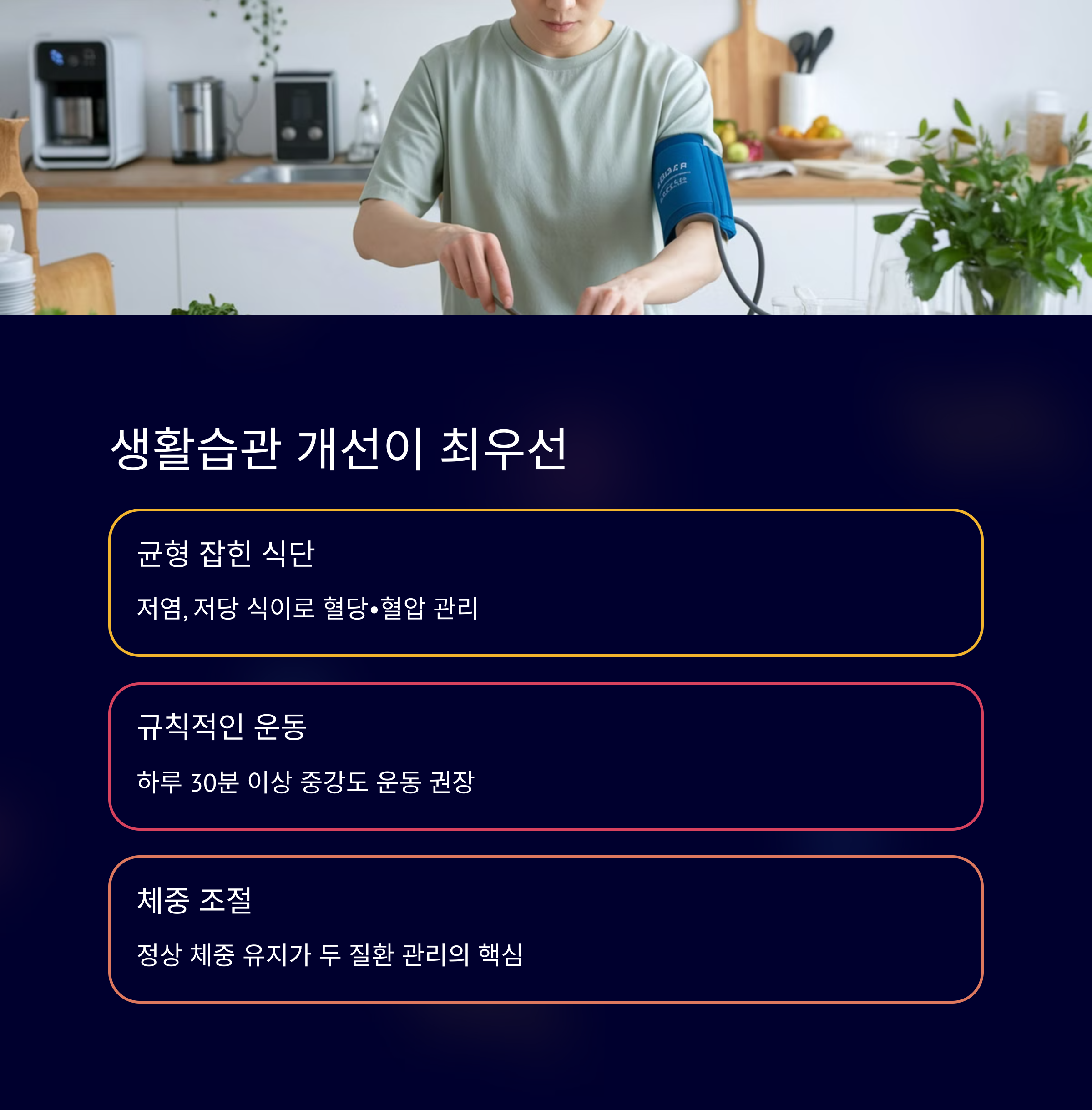 A8. 규칙적인 생활습관과 꾸준한 관리가 가장 중요해요. 정기적으로 혈압과 혈당을 체크하고, 건강한 식습관과 운동을 실천하며, 필요할 경우 약물 치료를 병행하면 건강을 지킬 수 있어요.