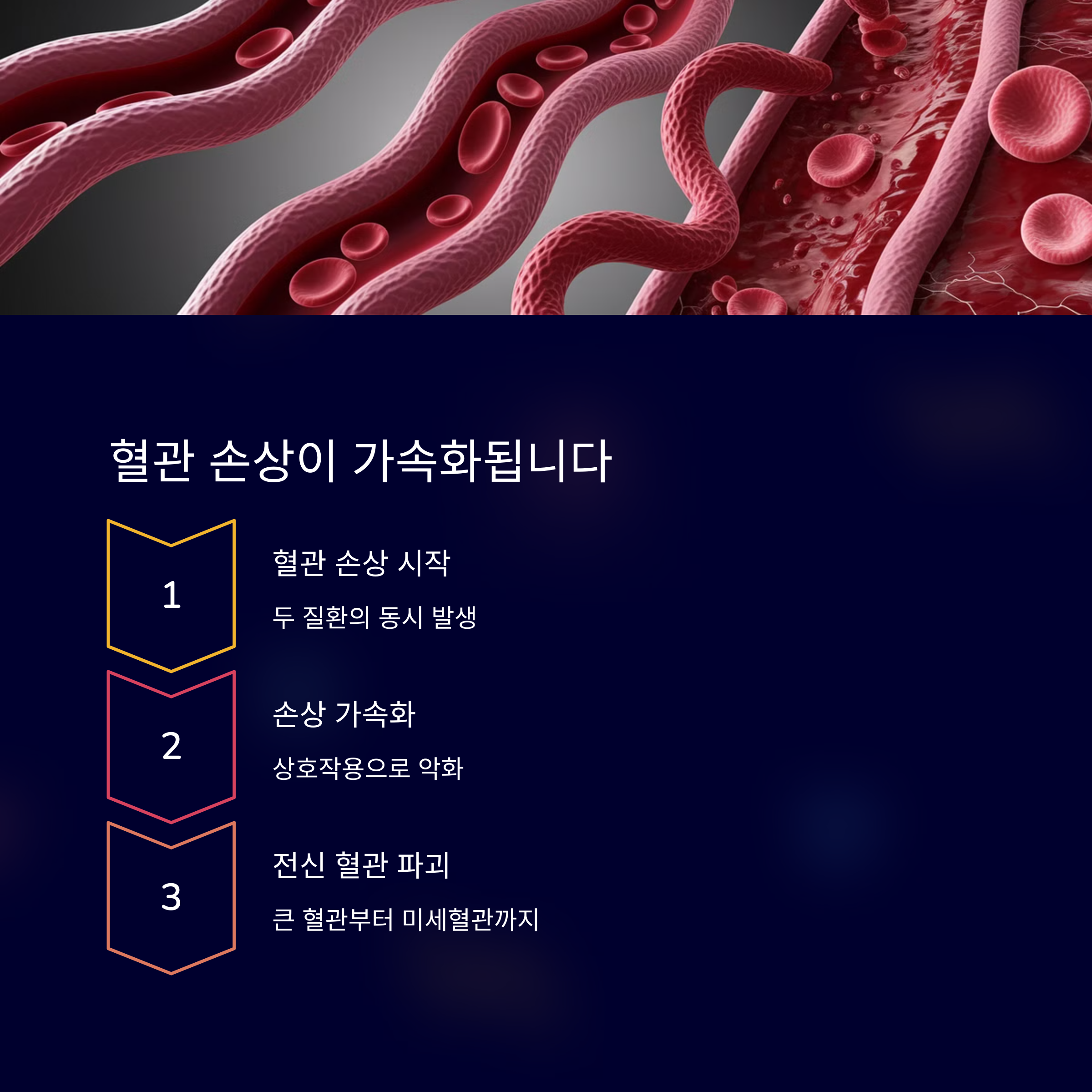 | 혈관 손상 | 혈압 상승 + 혈당 증가 | 동맥경화, 심근경색 |