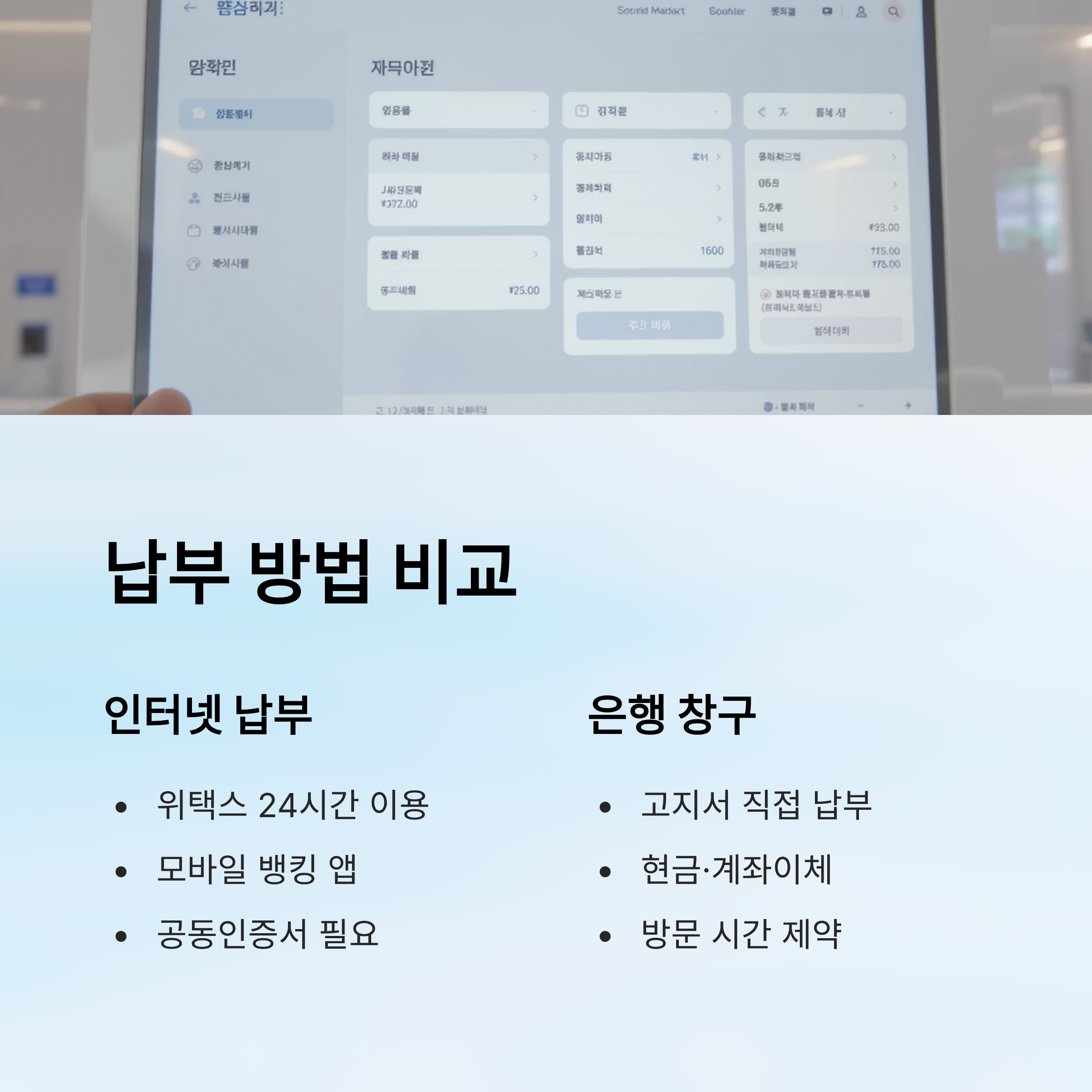 인터넷 납부는 ‘위택스(wetax.go.kr)’ 또는 ‘지방세입계좌’를 통해 24시간 납부할 수 있어서 바쁜 직장인에게 유리해요. 공동인증서나 간편 인증으로 접속하면 공과금 고지서 없이도 본인 소유 부동산의 세금 내역을 바로 확인할 수 있답니다.