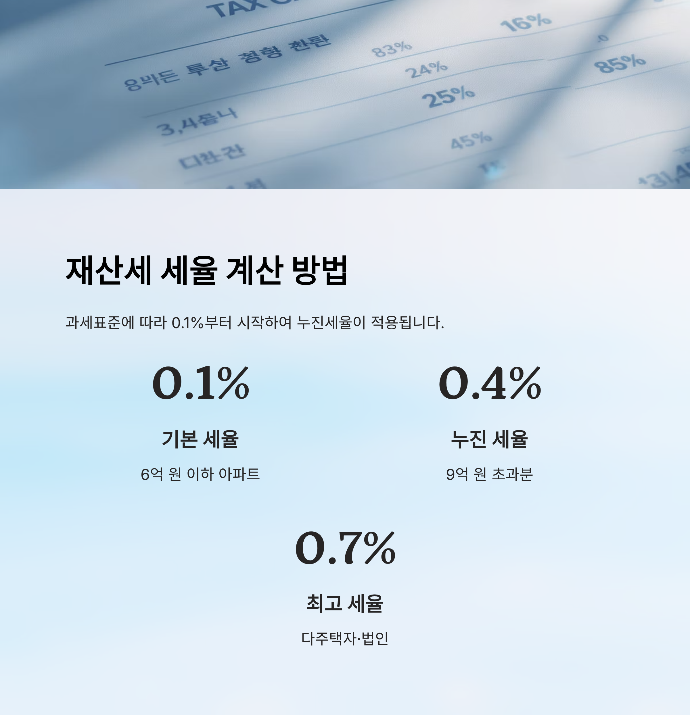 세율은 0.2%~0.5%로 구간별로 다르고, 다주택자나 법인 소유의 경우 최대 0.7%까지 올라갈 수 있어요. 특히 종합합산 대상 토지는 합산 기준 금액 초과 시 누진세가 적용돼 더 많은 세금을 내야 한답니다.