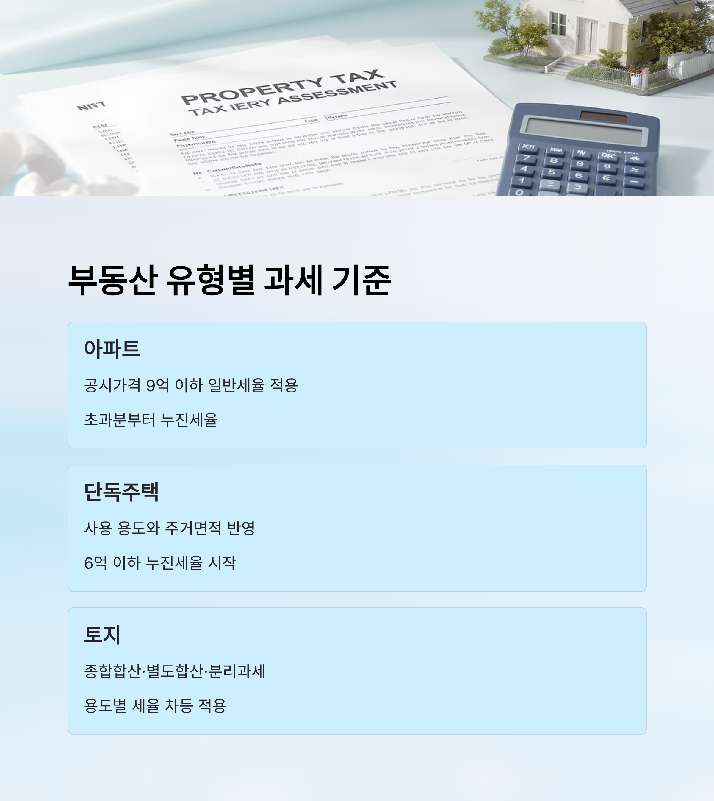 예를 들어 아파트는 공시가격이 9억 원 이하이면 0.1~0.4%의 일반세율이 적용되며, 초과분부터 누진세율이 붙어요. 반면 단독주택은 사용 용도와 주거 면적에 따라 세금이 달라지며, 토지는 '종합합산', '별도합산', '분리과세'로 나뉘어 과세된답니다.