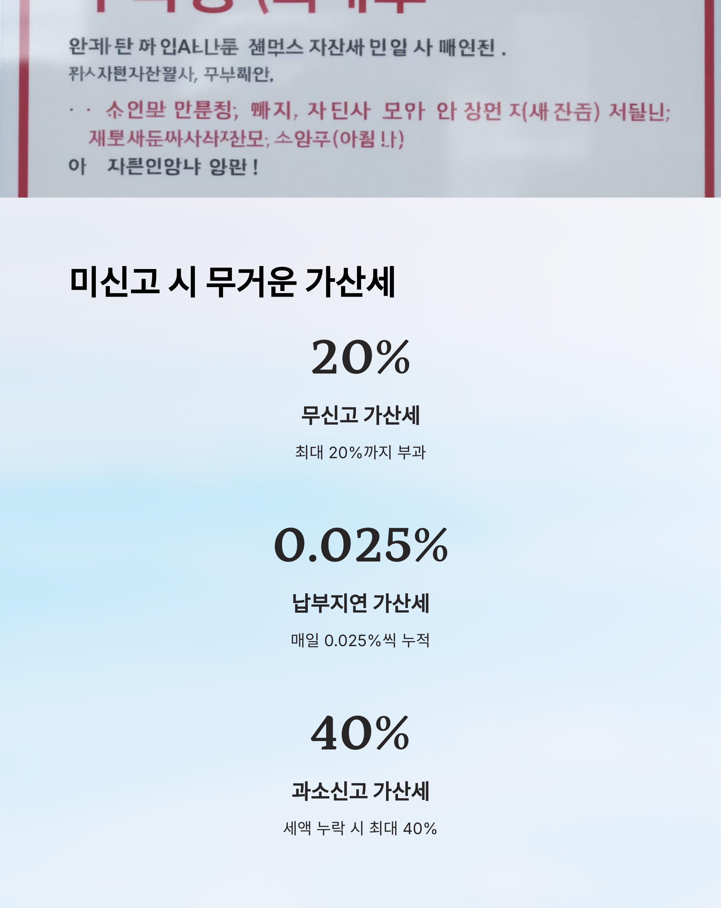 | 과소신고 가산세 | 세액 일부 누락 | 10~40% |