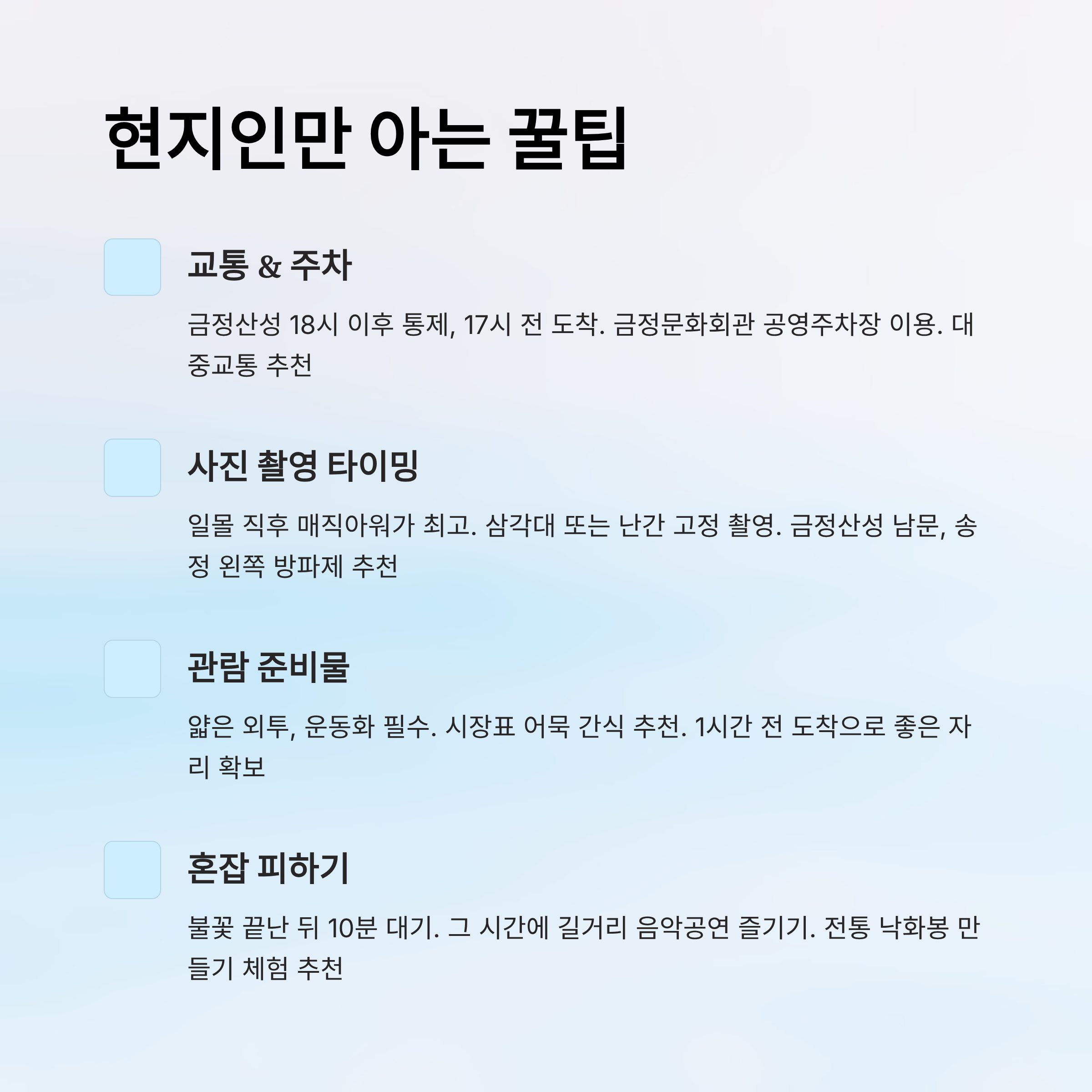 부산 낙화놀이를 제대로 즐기려면 현지인의 감각이 필요해요. 단순히 불꽃을 보는 걸 넘어, ‘부산의 봄밤’을 체험하는 방법을 알아두면 여행의 질이 확 달라지거든요. 여기엔 교통, 포토스팟, 혼잡 피하는 법, 그리고 축제 현장 꿀팁까지 모두 담았어요. 😉