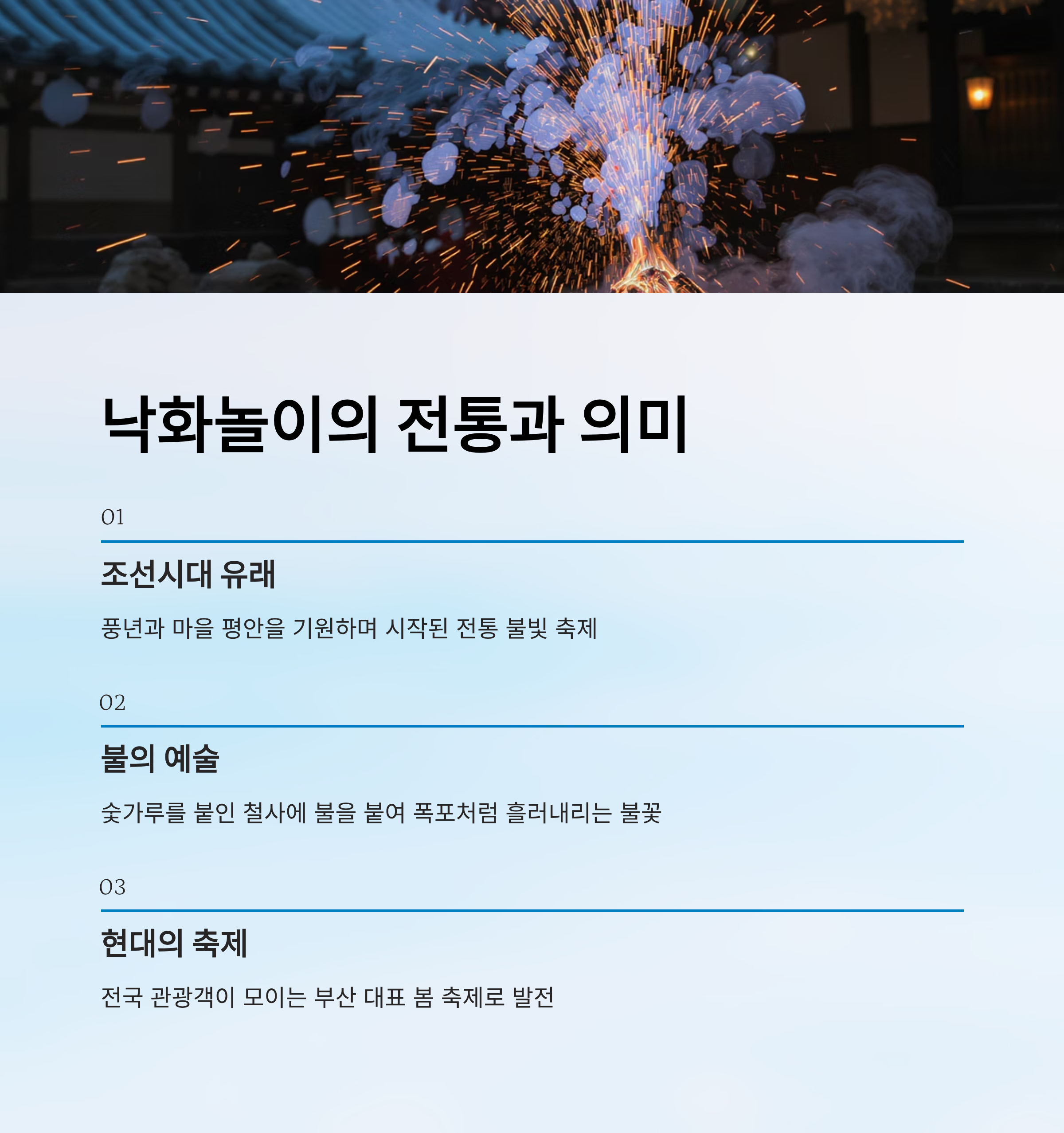 현재 부산의 낙화놀이는 지역 주민뿐 아니라 전국에서 많은 관광객이 모이는 대표 봄 축제가 되었어요. 2025년에는 문화재청의 후원으로 더 큰 규모로 열릴 예정이라, 전통공연과 함께 불꽃 퍼포먼스도 결합된 형태로 진행돼요. 부산의 봄을 상징하는 ‘불빛의 향연’으로 자리 잡았답니다. 🌠
