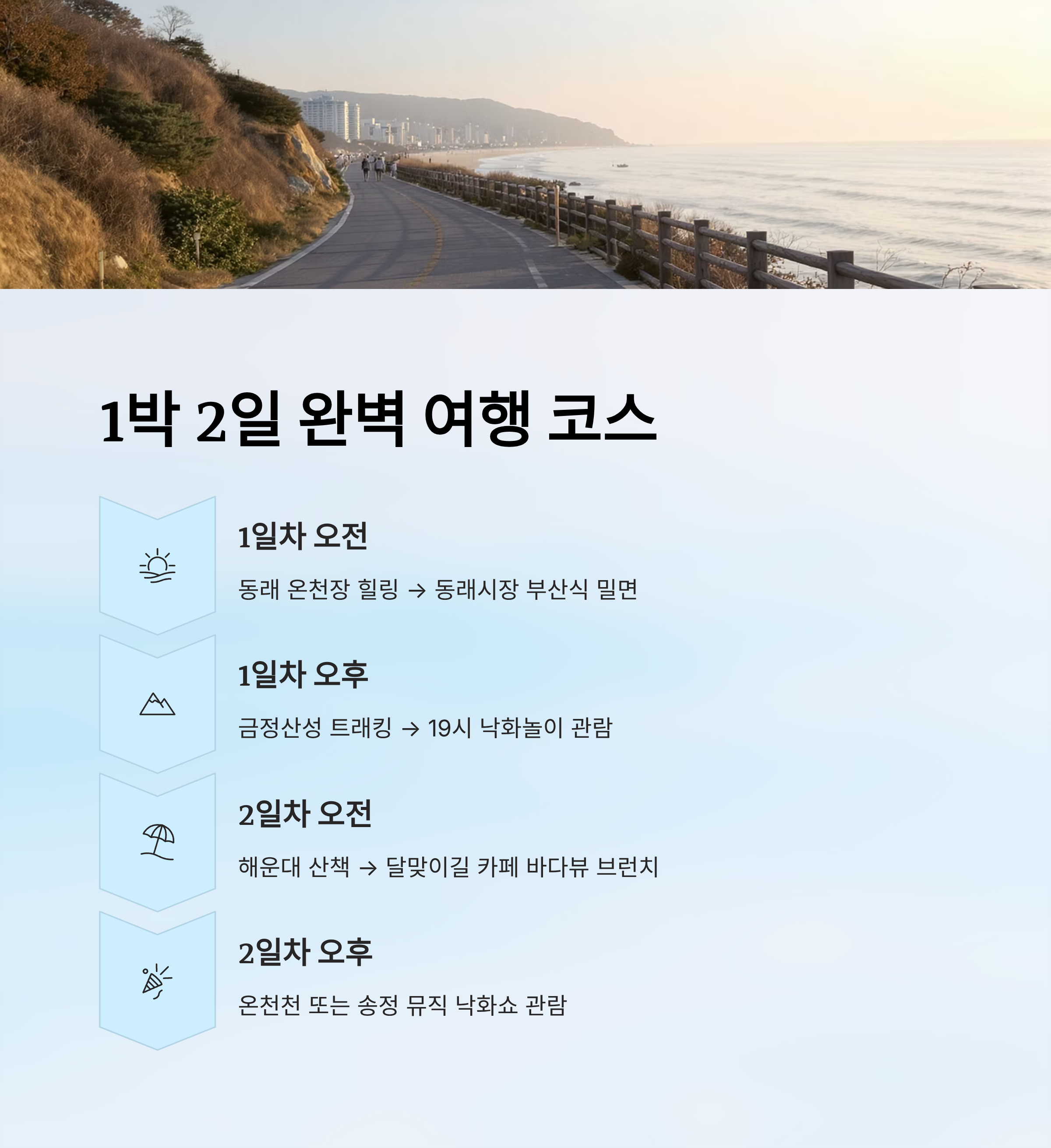 | 1일차 오전 | 온천장 힐링, 전통시장 탐방 | 동래 온천장, 동래시장 | 부산식 밀면 추천 |
