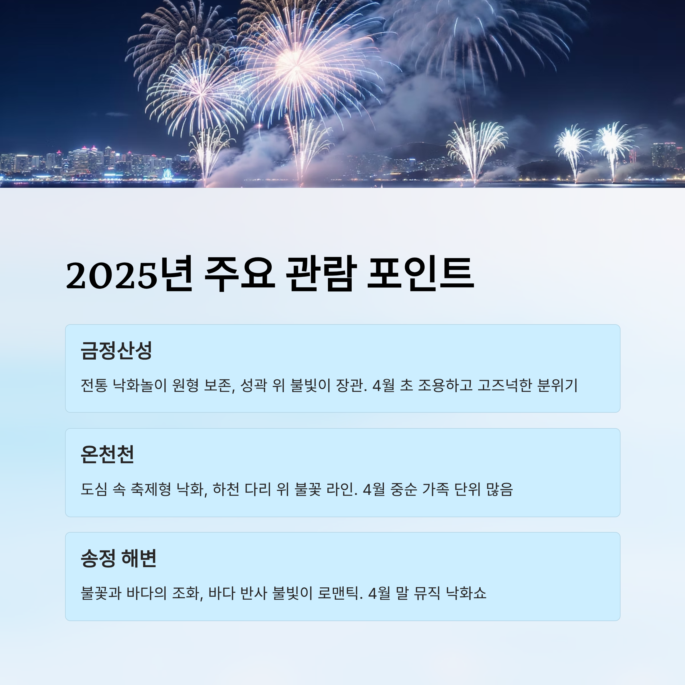 | 온천천 | 도심 속 축제형 낙화 | 4월 중순 | 활기차고 가족 단위 많음 | 하천 다리 위 불꽃 라인 |