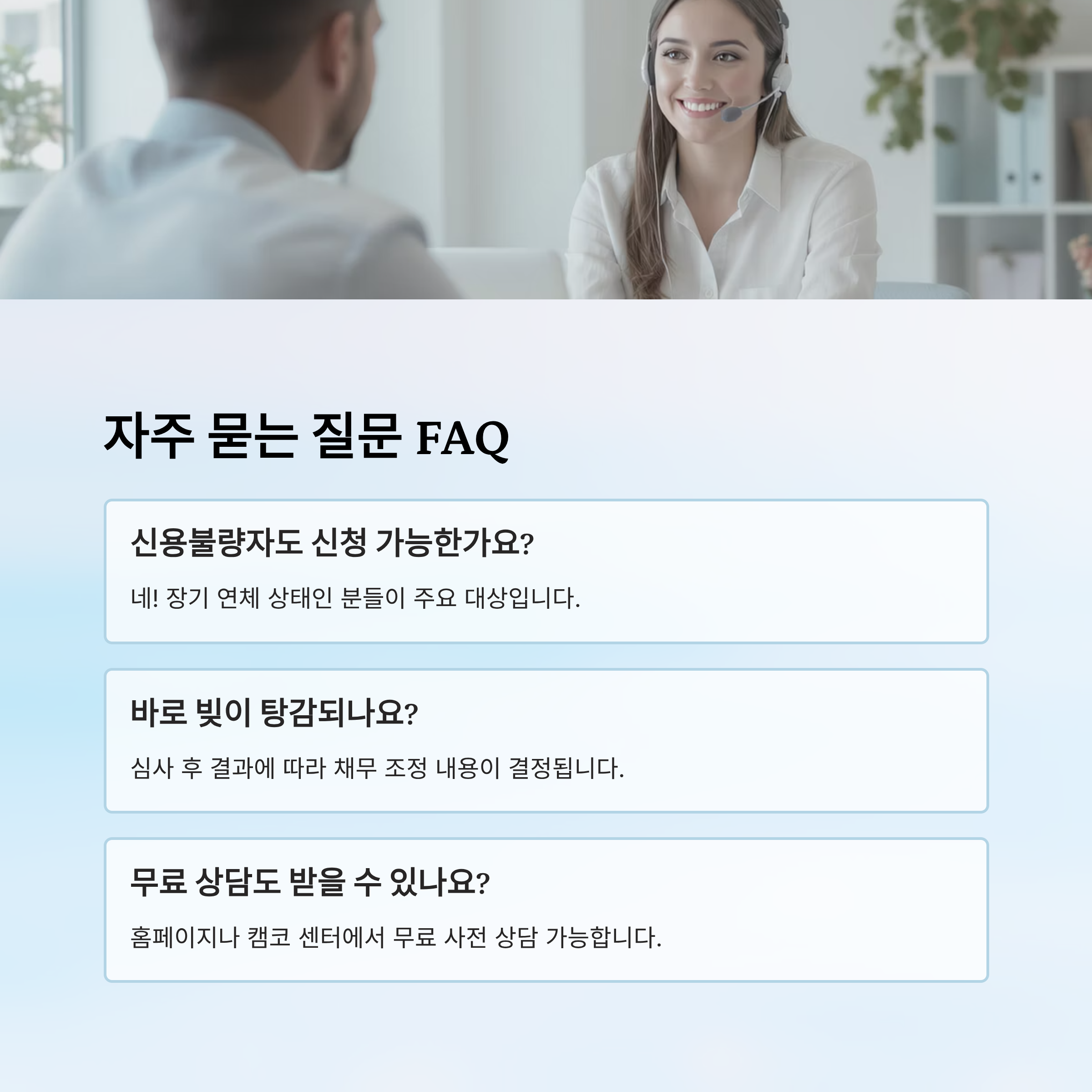 A1. 아니에요! 신청 후 심사를 거쳐야 하며, 결과에 따라 채무 조정 내용이 결정돼요. 모든 신청자가 즉시 감면을 받는 건 아니에요.