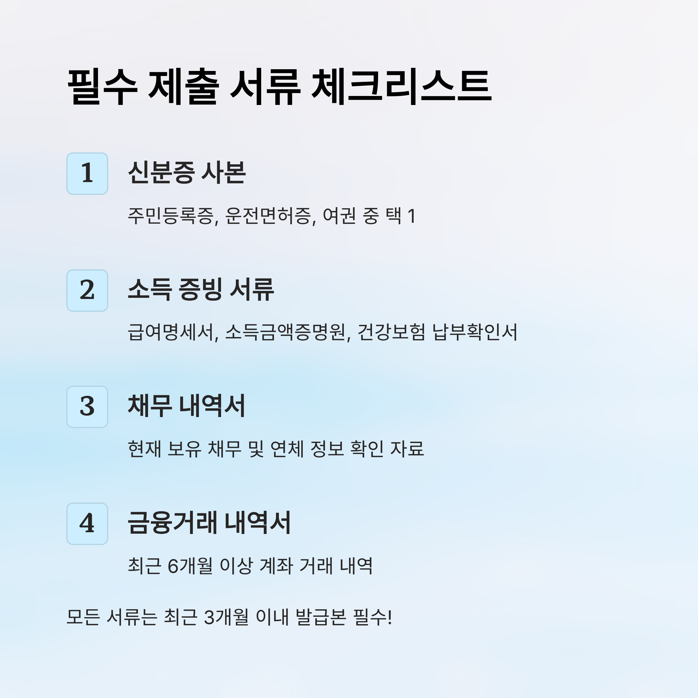 1. 신분증 사본: 주민등록증, 운전면허증, 여권 중 택 1 2. 소득 증빙 서류: 급여명세서, 소득금액증명원, 건강보험 납부확인서 등 3. 채무 내역서: 현재 보유한 채무 및 연체 정보를 확인할 수 있는 자료 4. 금융거래 내역서: 최근 6개월 이상 계좌 거래 내역