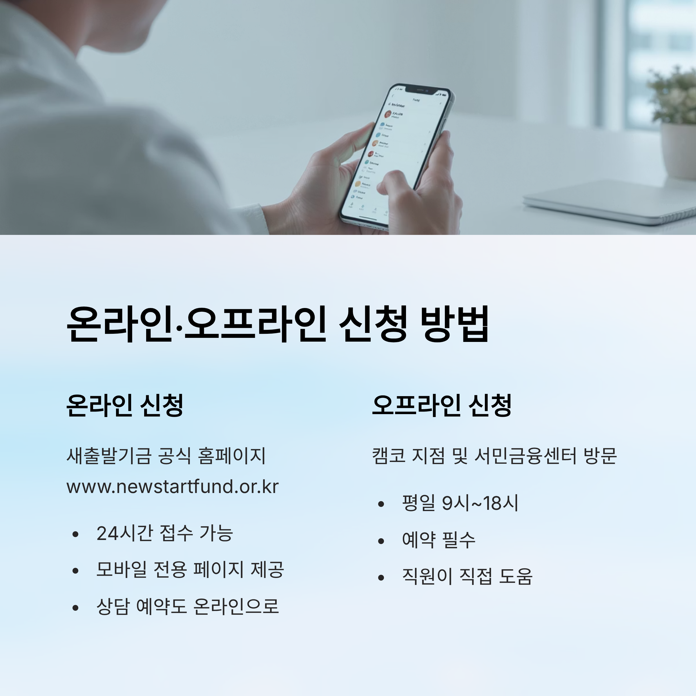 | 온라인 | 홈페이지 접수 (www.newstartfund.or.kr) | 24시간 가능 |