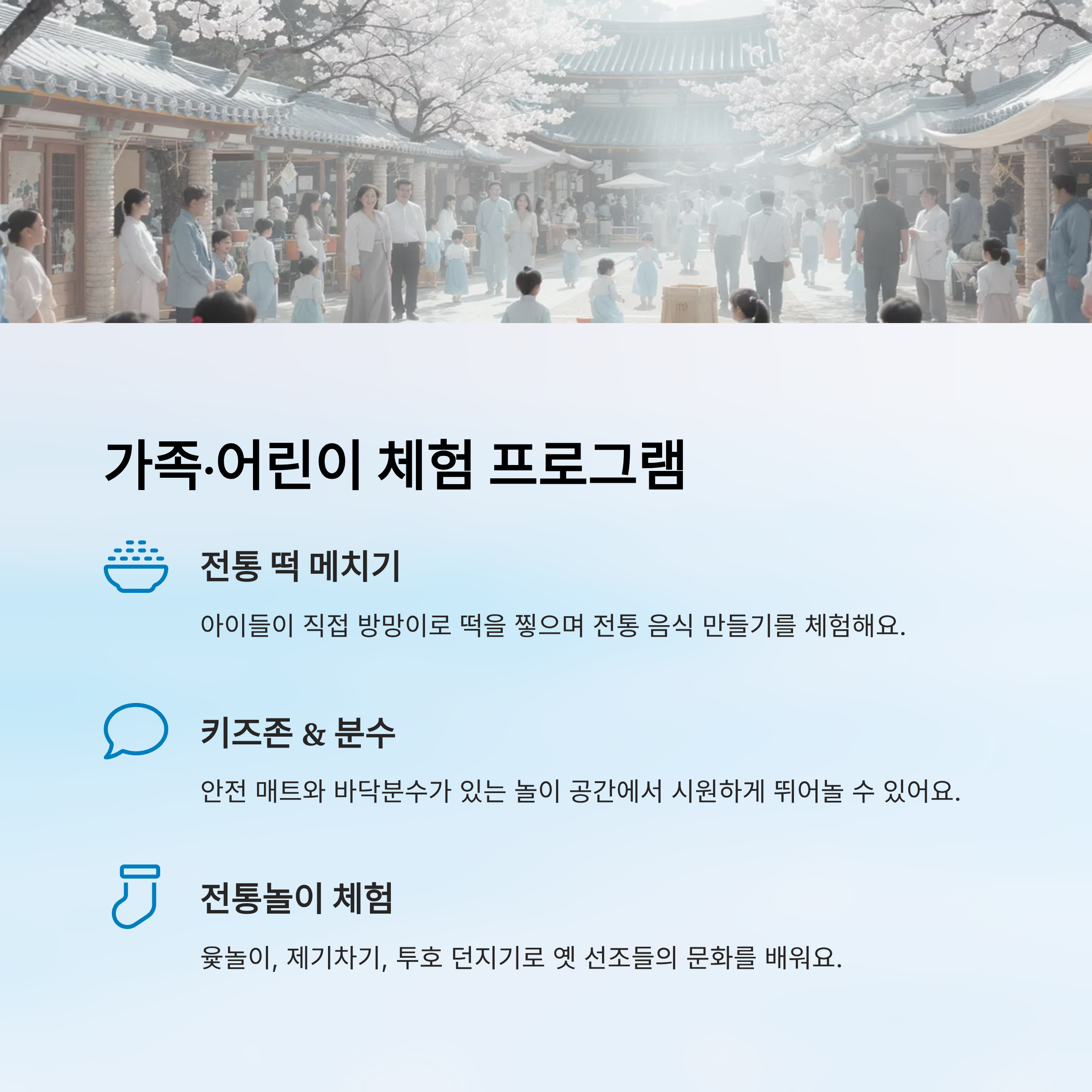 | 전통놀이 체험 | 윷놀이, 제기차기 등 | 전 연령 | 체험 부스 |