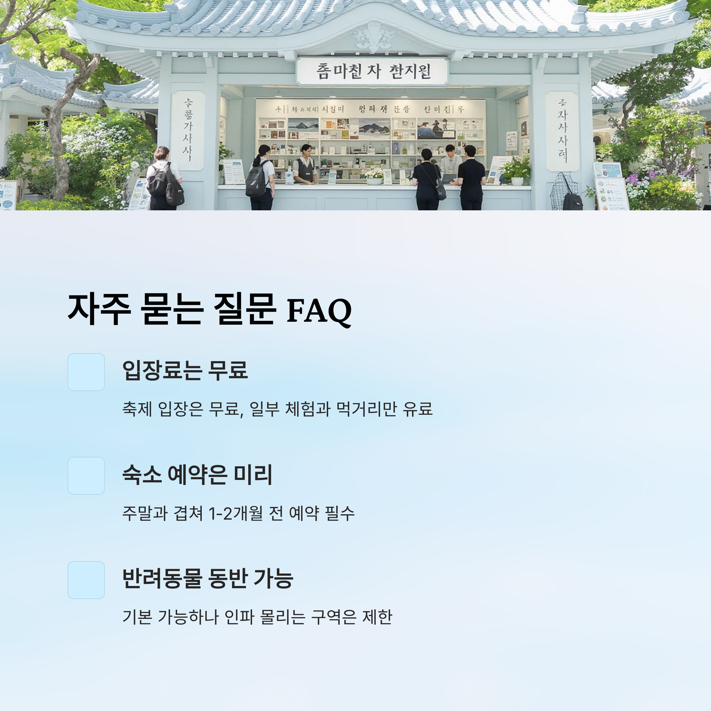 A1. 축제 입장은 무료예요. 다만 일부 체험 프로그램과 먹거리 부스는 유료로 운영돼요.