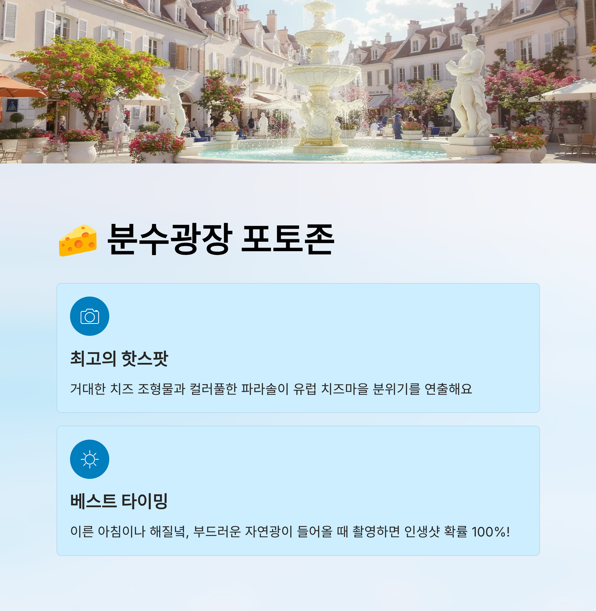 사진 팁을 드리자면, 분수를 배경으로 뒤돌아보는 포즈나, 조형물 앞에서 치즈를 먹는 듯한 연출을 하면 자연스럽고 생동감 있는 컷이 나와요. 저도 개인적으로 이곳에서 찍은 사진이 가장 반응이 좋았답니다. 🙌