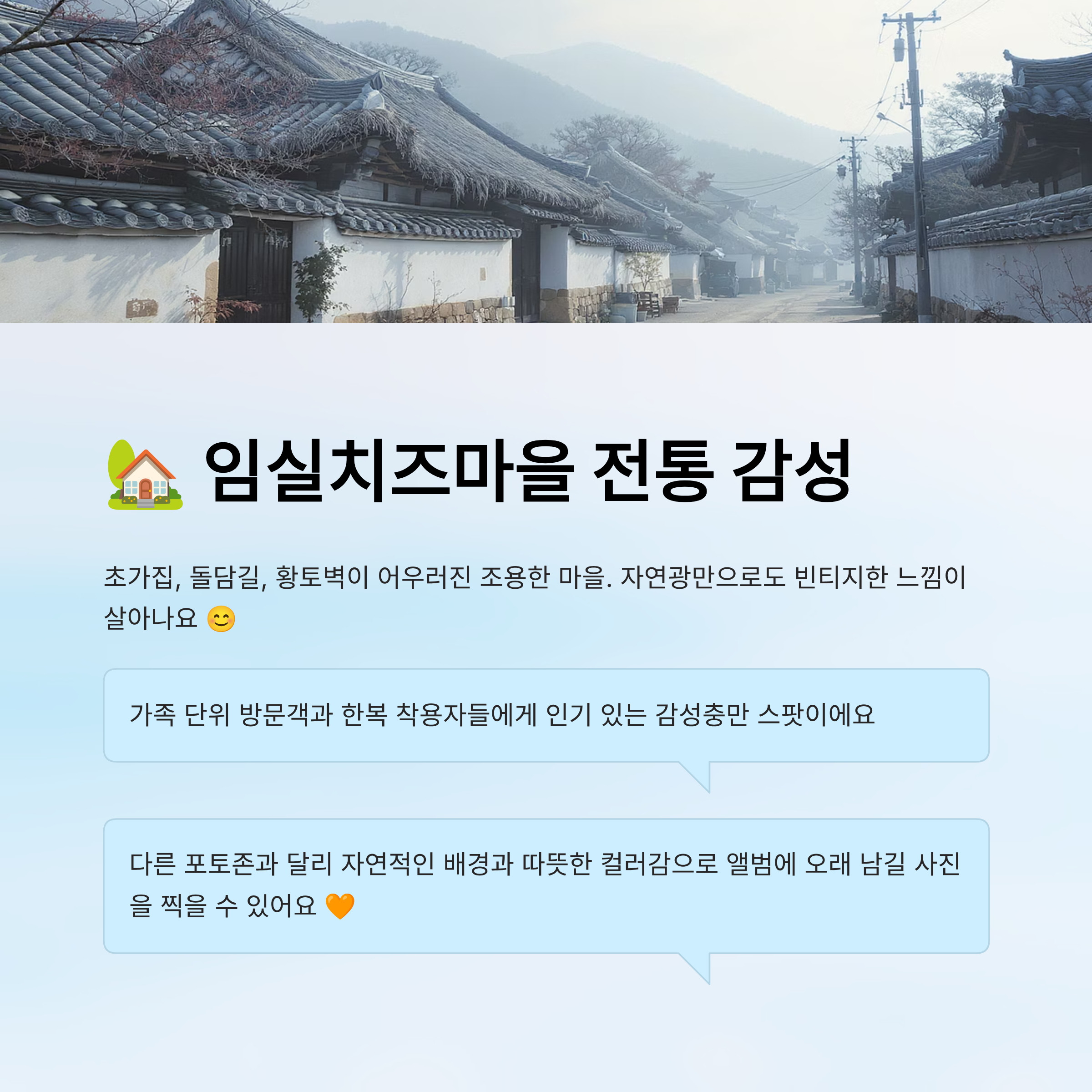 | 치즈마을 | 전 시간대 | 한복 or 감성컷 | 돌담길 활용 |