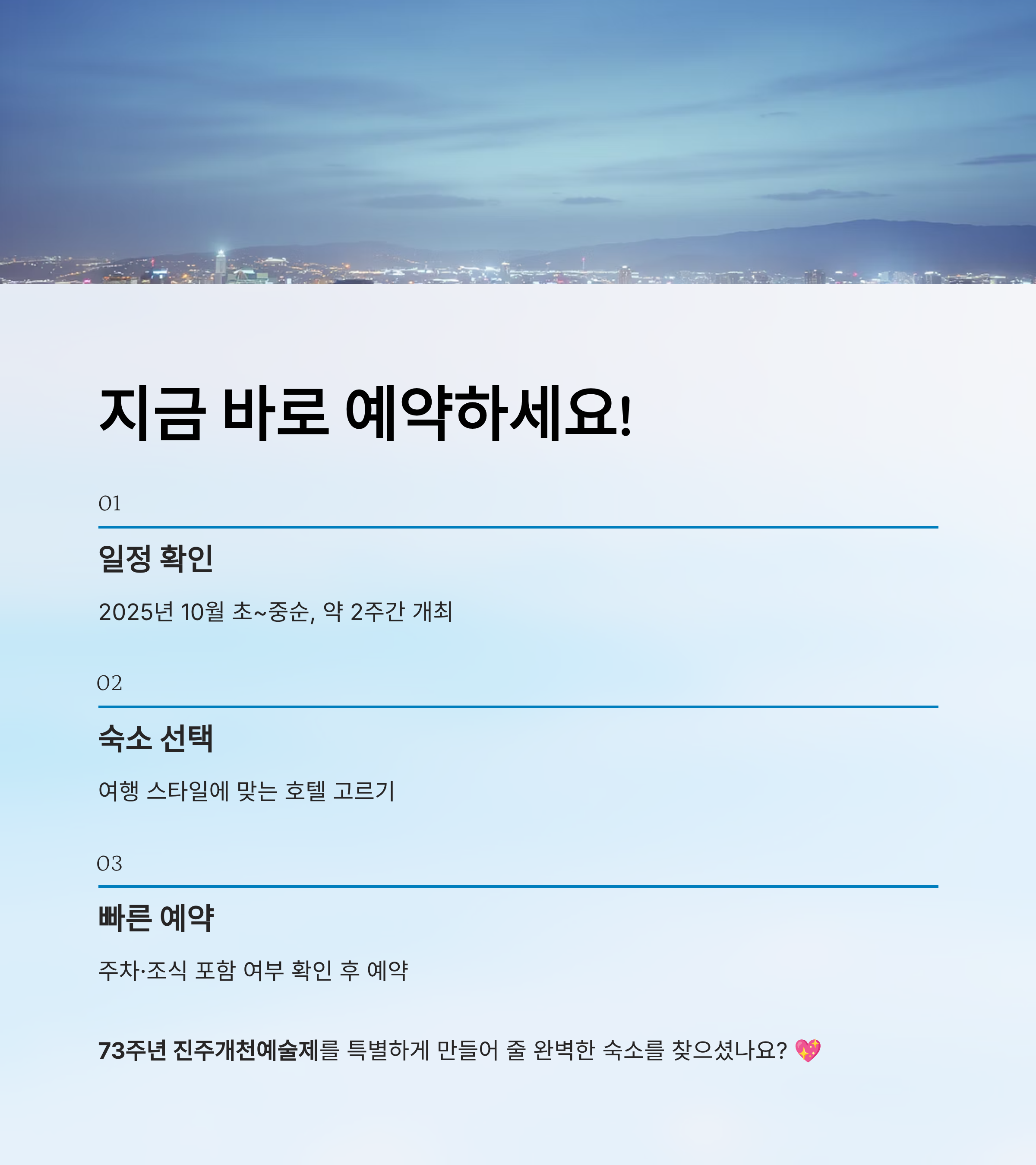 특히 2025년은 개천예술제의 73주년으로 다양한 공연과 불꽃놀이, 미디어아트 쇼까지 예정되어 있어서 예년보다도 숙소 수요가 높을 것으로 예상돼요. 이럴 땐 ‘가성비 좋은 숙소’를 미리 찾아두는 게 관건이겠죠?😉