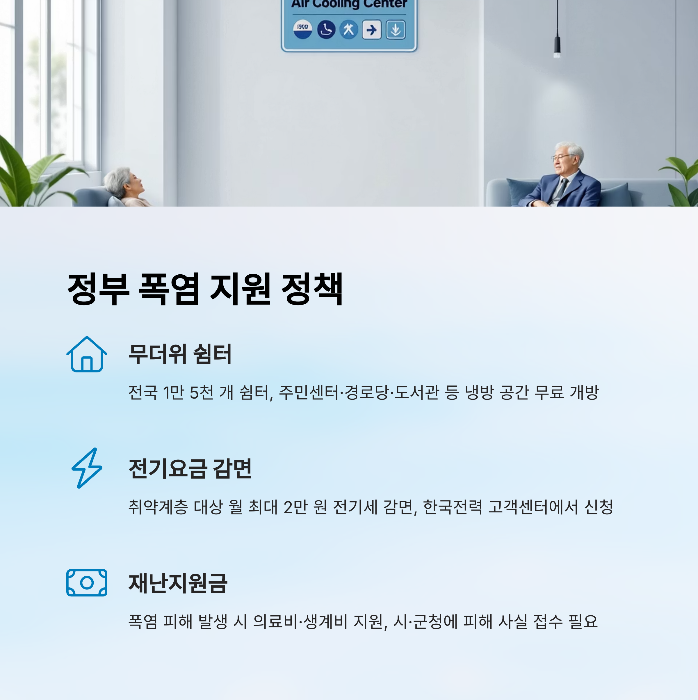 이렇게 다양한 정책들이 폭염 속에서 우리의 건강과 생활을 지켜주는 든든한 안전망이 되어주고 있어요. 중요한 건 이런 제도를 알고, 실제로 활용해보는 거예요. 특히 가족이나 이웃 중 도움이 필요한 분이 있다면 꼭 함께 안내해주세요!