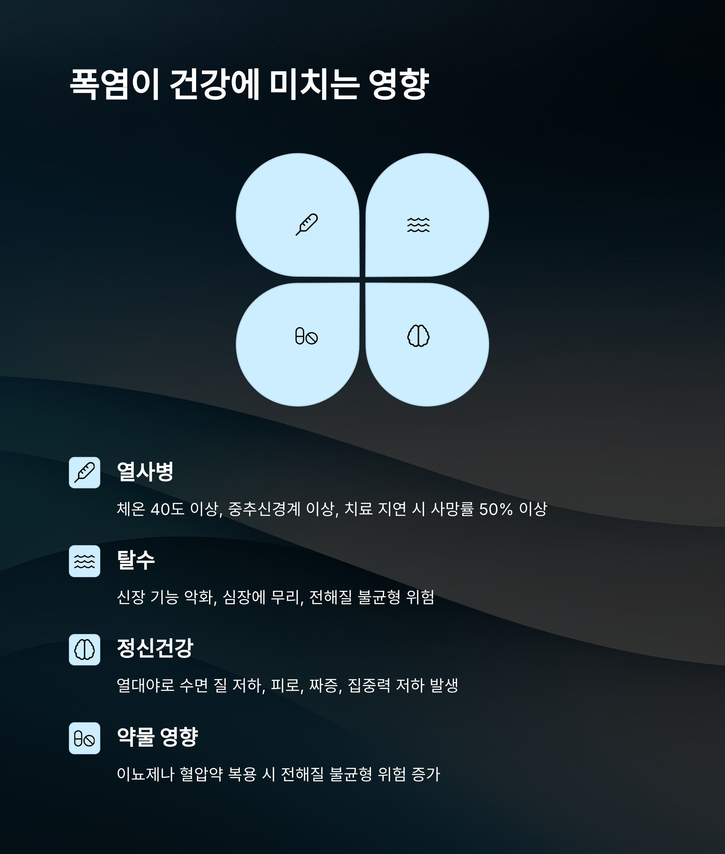 폭염이 위험한 이유는 단순히 불쾌감을 주는 것을 넘어서, 신체 기능에 심각한 영향을 끼치기 때문이에요. 체온 조절 능력이 떨어지면 생명에 직결되는 온열질환이 발생할 수 있어요. 특히 65세 이상 고령자나 만성질환자는 폭염의 영향을 가장 많이 받아요.